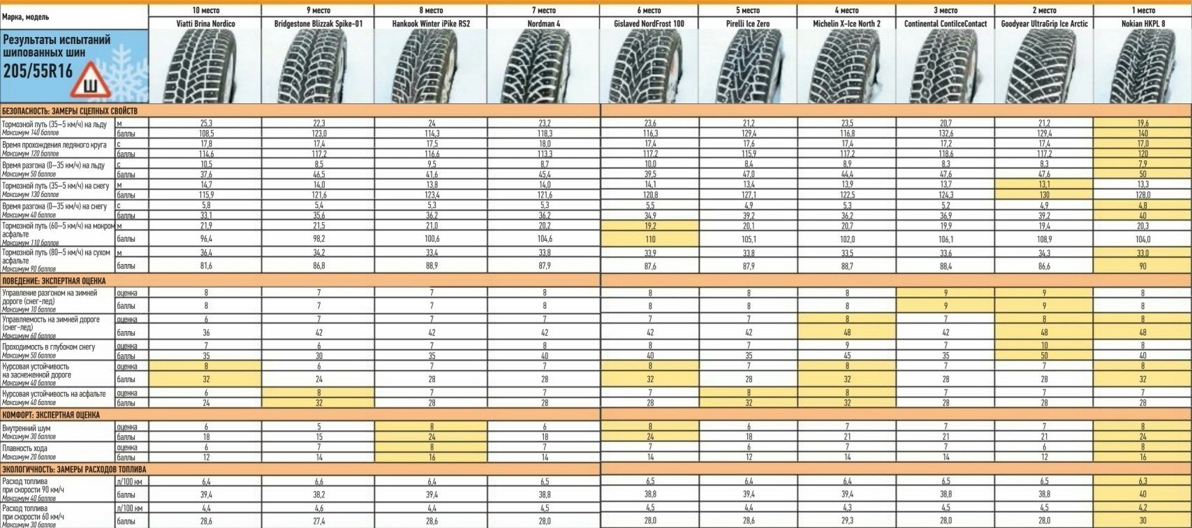 Безоговорочным лидером теста является новинка от компании Nokian (938 баллов). Восьмая Hakka стала победителем сразу в нескольких испытаниях. Далеко не последнюю роль в хороших результатах сыграло большое количество шипов. Мы насчитали 190 штук на одну R16-шину 205/55. Правда, и стоимость одной покрышки бьёт все рекорды – 7100 рублей, которая сделала коэффициент цена/эксплуатационные характеристики, равным 7,70.